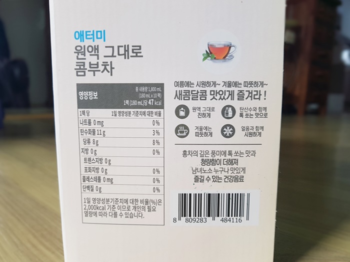 애터미 콤부차 한 상자에 180ml 짜리 10개가 들어가 있습니다. 한 포에 180ml 씩 들어있는 양이 적은 줄 알았는데 컵에 따라서 먹어봤더니 차 한잔 마시는 양만큼 되었습니다. 커피 한잔을 마시듯 작업할 때 건강한 발효차를 마시는 것도 괜찮았습니다.