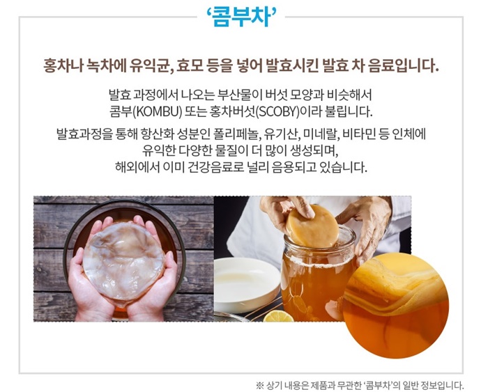 콤부차는 홍차나 녹차에 유익균, 효모 등을 넣어 발효시킨 건강한 발효 음료입니다. 발효과정에 첨가되는 부산물이 버섯모양과 비슷해서 홍차버섯(SCOBY)라 불리고 있습니다.