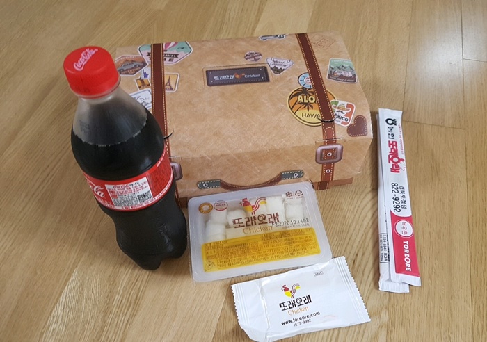 또래오래치킨 상자가 바뀌었네요. 전에는 납작하고 넓은 피자상자같았는데 이젠 일반 치킨상자로 바뀌었어요. 갈릭반핫양념반, 콜라, 그리고 치킨무가 들어있어요. 갈릭반핫양념반 가격은 19,000원이고 배달료는 받지 않더라구요. 그래서 쿠폰 13장과 현금 6,000원을 배달아저씨에게 줬어요.