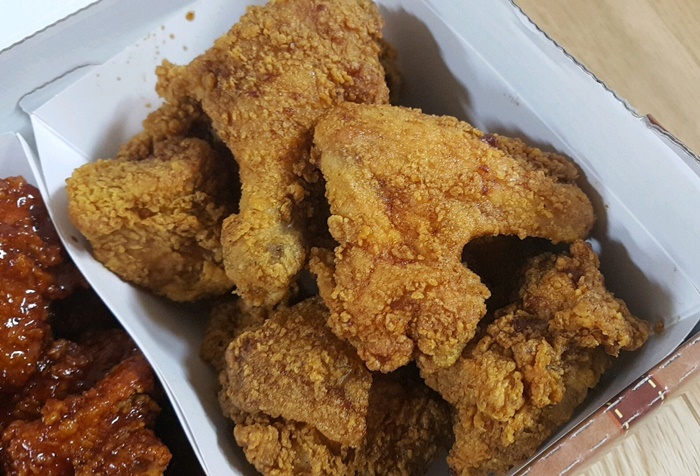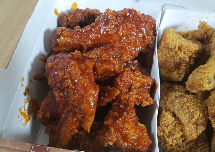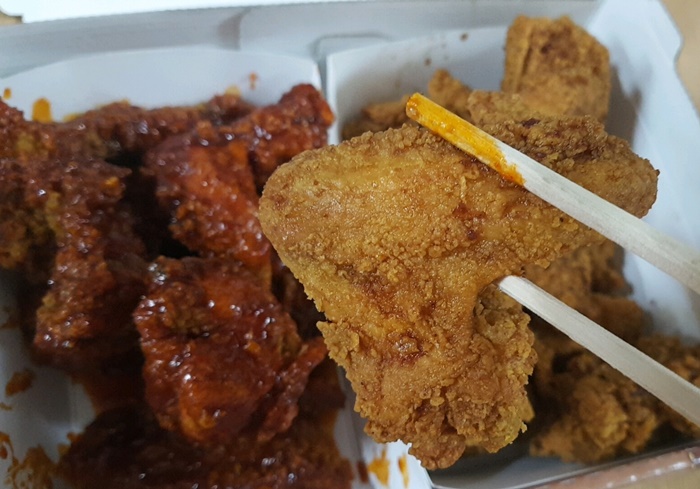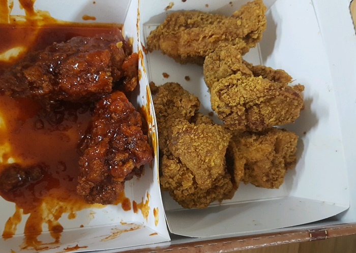 핫양념치킨은 또래오래치킨의 양념치킨과 비슷하게 튀긴 치킨에 양념을 버무리는 듯 묻혀있었고 거기에 매운 고추맛을 첨가한 것 같았습니다. 또래오래치킨의 매력은 후라이드된 치킨에 양념을 묻힌 듯 나오는 것이죠. 그래서 저는 크런치한 치킨에 양념 소스를 골고루 찍어먹는 기분이었습니다.