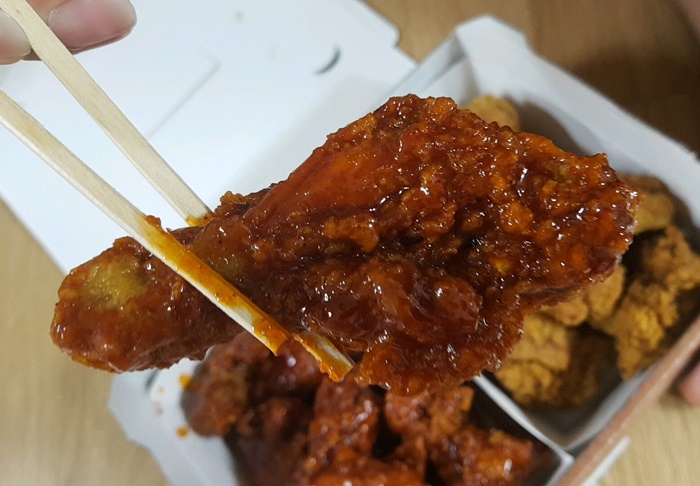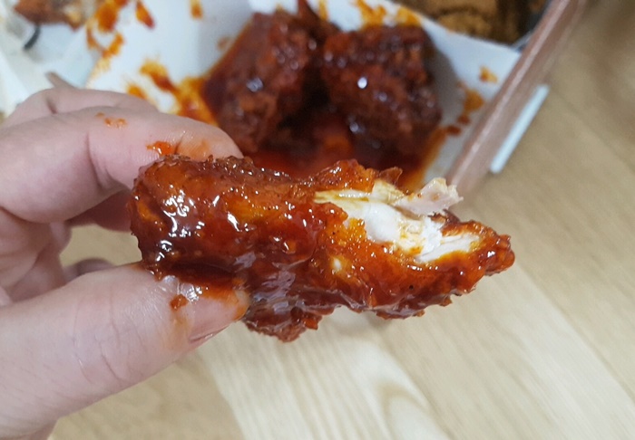 핫양념치킨의 매운맛은 입에 못댈 정도로 맵진 않았습니다. 단 입안과 혓바닥이 좀 놀라는 정도인데 매운맛을 전혀 못 먹는 사람에게 피하라고 하고 싶어요. 어느 정도 매운 음식을 먹는 사람에게는 추천하고 싶은 맛입니다.
