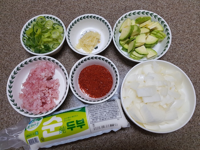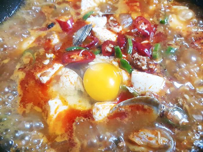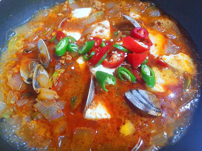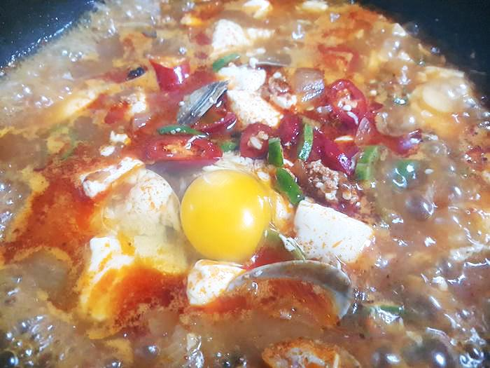 재료 : 바지락 10개, 순두부 1개, 돼지고기 다짐육 100g, 대파, 다진마늘, 고춧가루 1T, 애호박, 양파, 달걀, 풋고추, 홍고추, 참기름
