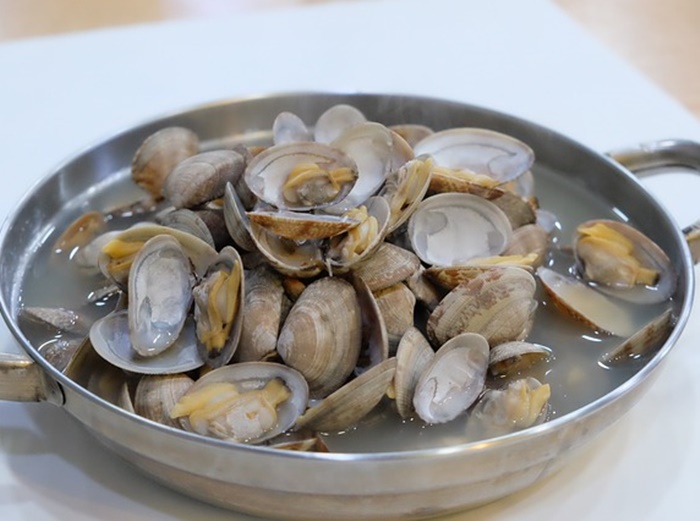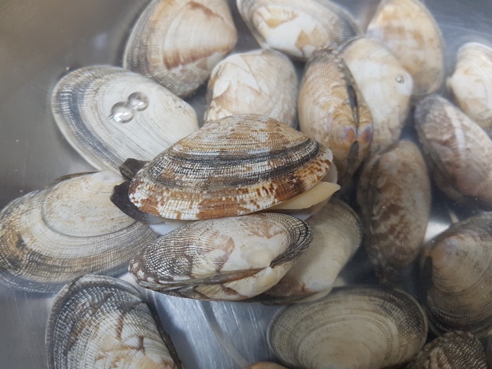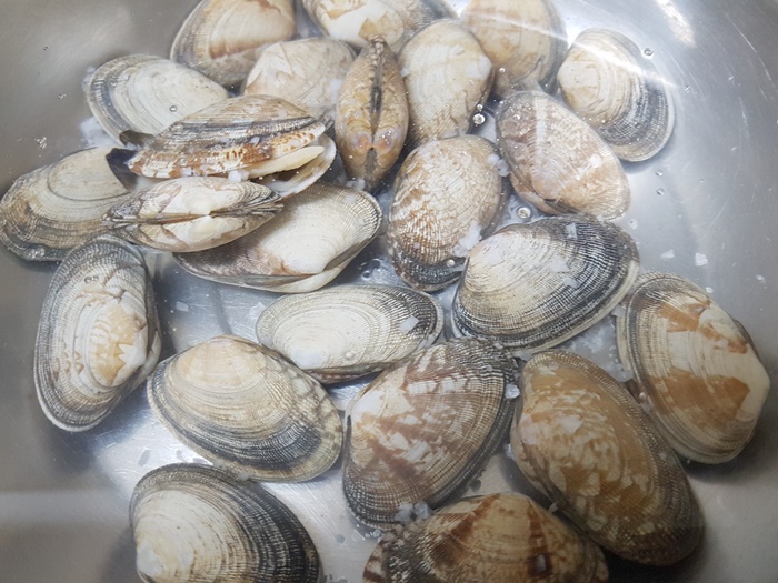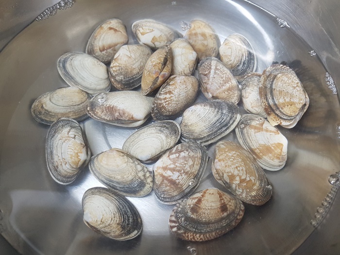1. 적당한 용기에 바지락을 깨끗이 씻어냅니다.
