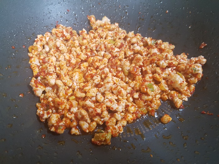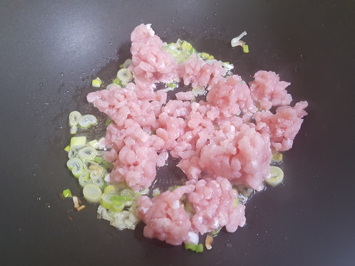 5. 파기름에 돼지고기 다짐육을 볶는다.