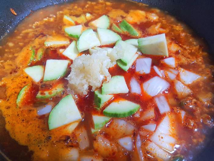 8. 물이 끓으면 애호박, 양파, 다진마늘, 바지락을 넣어준다.