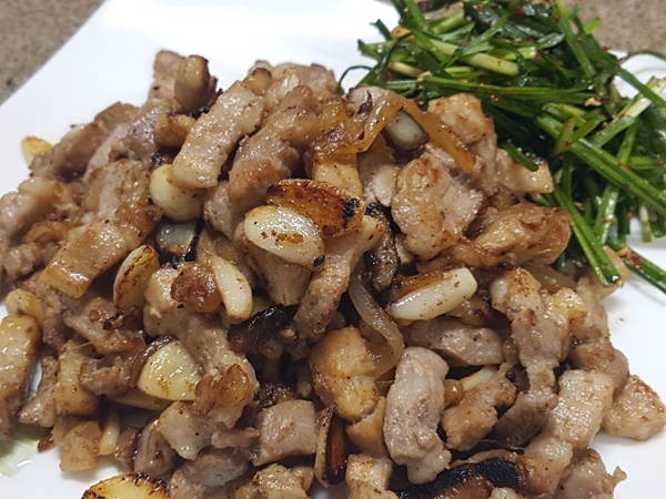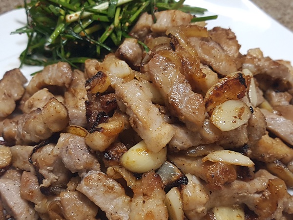 돼지삼겹살 600g, 마늘, 양파, 청양고추, 소금, 후추, 부추, 식초, 간장, 설탕, 고추가루, 깨