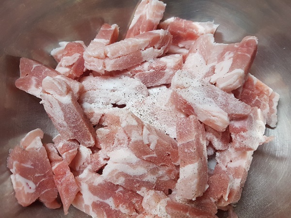 2. 소금, 후추를 넣어 삼겹살에 밑간을 해줍니다.