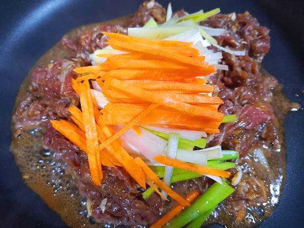 9. 달궈진 팬에 양념된 소불고기와 채썰어 놓은 채소들을 올려 맛있게 구워줍니다.