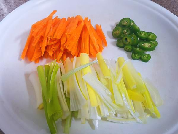 8. 당근, 양파, 대파 등 불고기에 필요한 채소들을 채 썰어서 준비합니다.