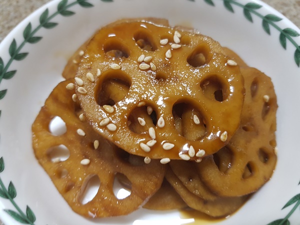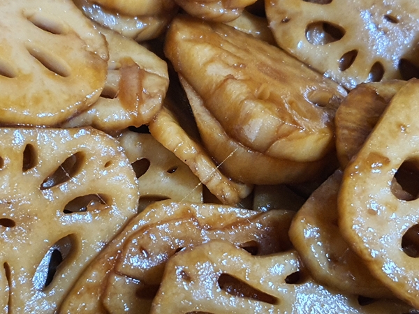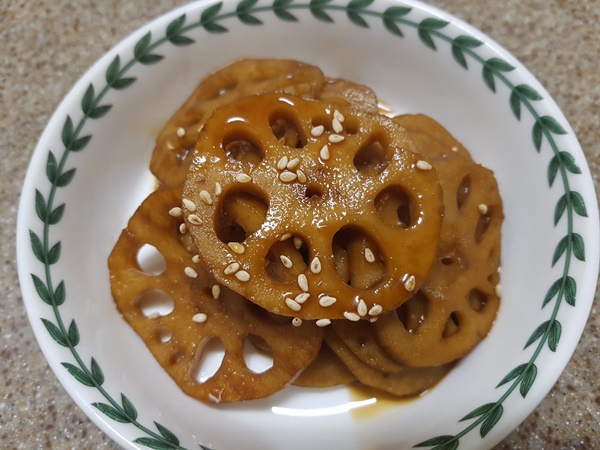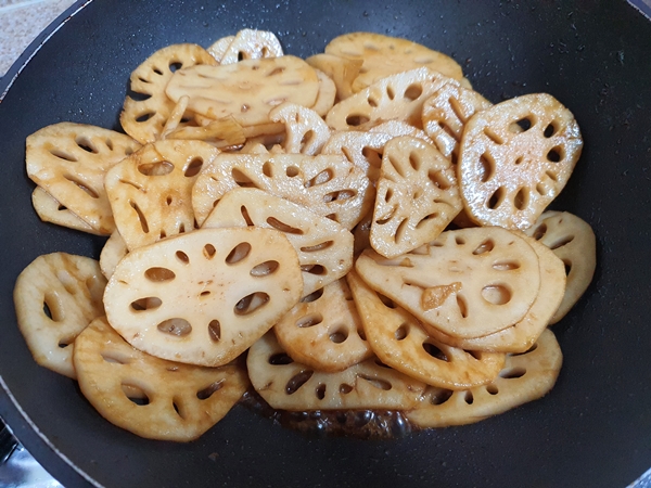 8. 졸여진 연근 사이로 실같은 점액이 생기게 되면 불을 끄고 참기름이나 올리브유를 넣어 윤기를 내줍니다.