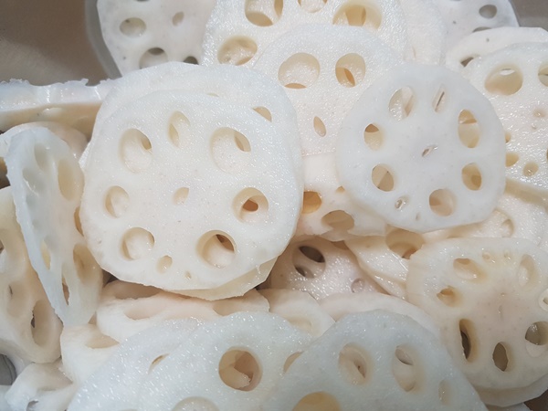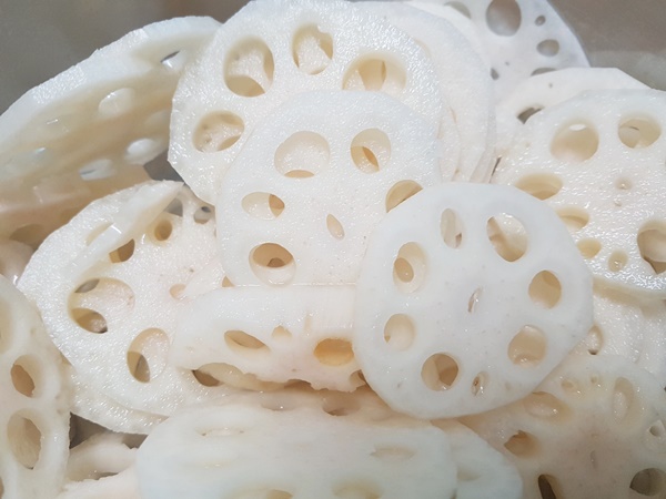 1. 연근을 깨끗이 씻은 후 0.4cm정도의 굵기로 썰어줍니다.
