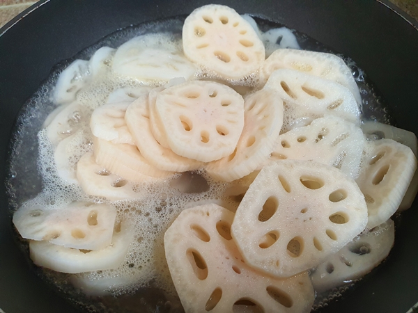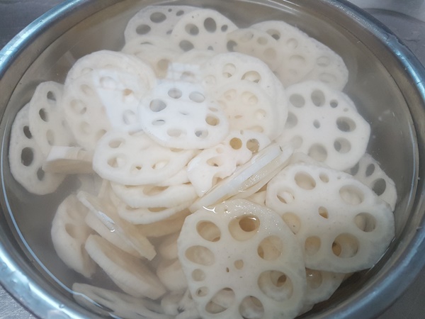 2. 용기에 연근에 물을 붓고 식초를 넣어 살짝 삶아줍니다.