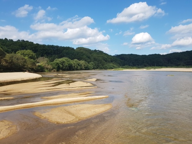 지금은 무섬마을에 차들이 드나들 수 있게 수도교를 만들어 놓아 쉽게 드나들 수 있는 곳이 되었습니다. 여름 장마철을 피한다면 무섬마을에 아이들과 즐겁게 놀다 올 수 있는 곳이라서 추천하고 싶었어요. 하얀 모래사장이 드넓게 펼쳐져 있고 얕은 수심에 아이들이 물장구를 치며 놀 수 있기 때문입니다.