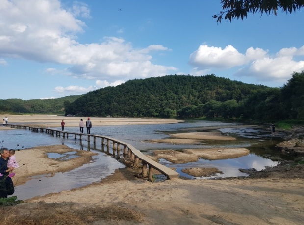 영주 두번째 가볼만한 곳은 무섬마을입니다. 무섬마을은 안동 하회마을과 비슷하게 강이 마을을 휘감듯 지나가는 것이 특징입니다. 그리고 무섬마을 안으로 들어가기 위해 사람들은 외나무다리를 만들어 놓았습니다.