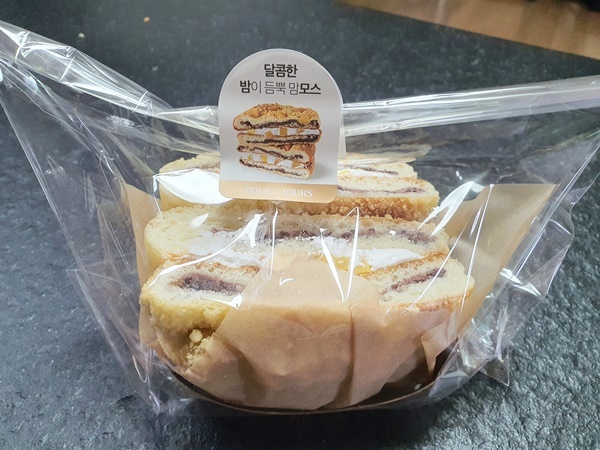 뚜레쥬르 지점마다 맛이 다르겠지만 저희 집 근처 매장에서는 크림이 다소 부족한 것 같습니다. 빵은 역시 크림이 맛을 좌우하는데 작은 사이즈라 그런지 조금 부족한 느낌이. 밤이 듬뿍 맘모스를 냉장실에 넣어뒀다 크림이 약간 굳었을 때 먹었습니다. 그렇지 않으면 크림이 묽어서 흘러내릴 수 있거든요. 어릴 적 밤이 들어간 추억의 빵이 생각나는 빵이었습니다