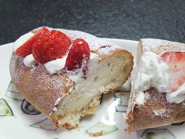 마담 얼그레이 크림번을 이어 딸기시즌에 맞게 딸기를 올렸습니다. 딸기 세 개를 반으로 쪼개어 나란히 올라가 있는데 한 입 베어먹었을 때 딸기맛이 상큼해서 입 안에 딸기향이 퍼졌습니다. 그리고 얼그레이가 박힌 크림은 달콤한 맛이 나면서 많이 달지도 않은 것이 은은하니 깊은 맛이 났습니다.