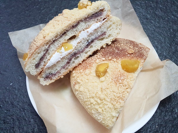 밤이 듬뿍 맘모스는 아빠가 좋아하는 빵입니다. 밤이 듬뿍 맘모스에는 손톱만한 크기의 밤이 속속 박혀 있습니다. 빵 속에는 단팥의 앙금과 아삭아삭 씹히는 달콤한 밤과 부드러운 고구마가 들어가 있고 단팥이 들어간 빵과 빵 사이에 크림이 들어가 있어요. 어른들 입맛에는 좋아할 것 같은 재료들이 듬뿍 들어가 있습니다.
