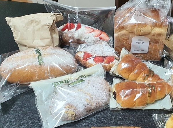 뚜레쥬르 가게에서 종류별로 다 사온듯한 이 빵들을 언제 다 먹을지 걱정됩니다. 그래서 오래도록 먹을 수 있는 빵들은 냉동실에 넣고 빨리 먹어야 하는 빵들은 냉장실에 뒀습니다. 아이들은 먹을게 많아져서 좋고 딸기시즌이라 딸기 들어간 거 서로 먹겠다며 쟁탈전을 벌이네요.