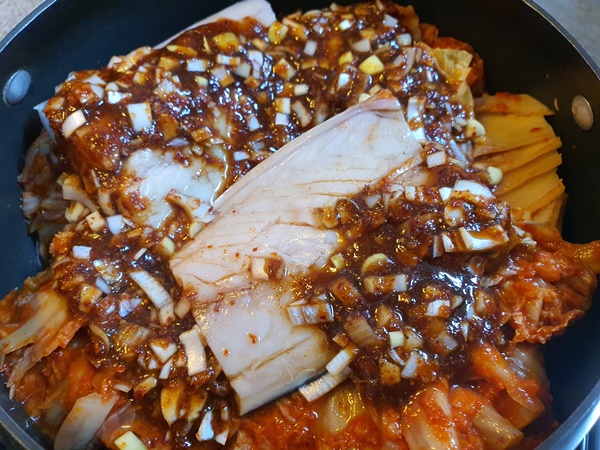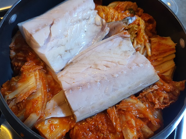 5. 냄비에 무를 깔고 그 위에 김치를 올린 후 고등어까지 올려줍니다.
