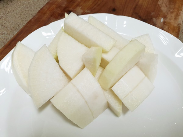 2. 무를 1cm 정도 도톰하게 썰어줍니다.