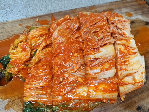 4. 김치는 먹을 크기 정도로 썰어줍니다.