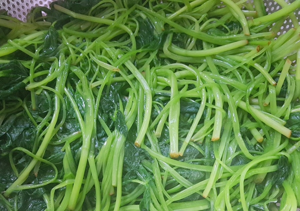 4. 줄기부분을 손톱으로 눌렀을 때 세로로 찢어지면 불을 끄고 찬물에 담궈 두세번 헹굽니다.