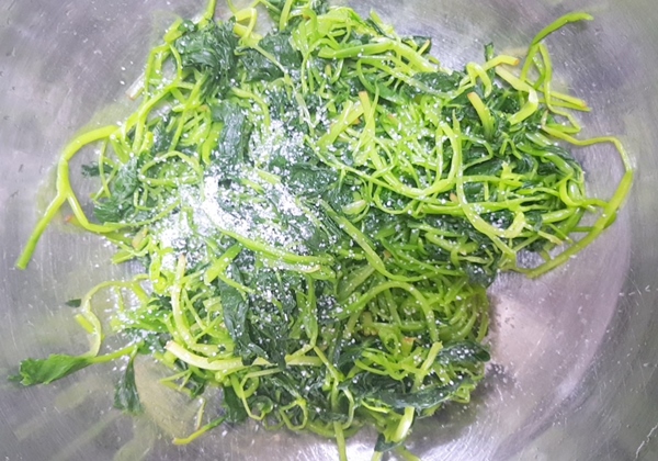 6. 볼에 물기를 짠 참나물을 넣어 풀어줍니다. 먼저 소금1/2스푼을 넣어 풀어주듯이 살짝 소금이 베이도록 무쳐줍니다.