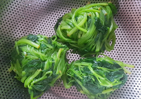 5. 참나물을 건져 두 손으로 물기를 꼭 짜줍니다.