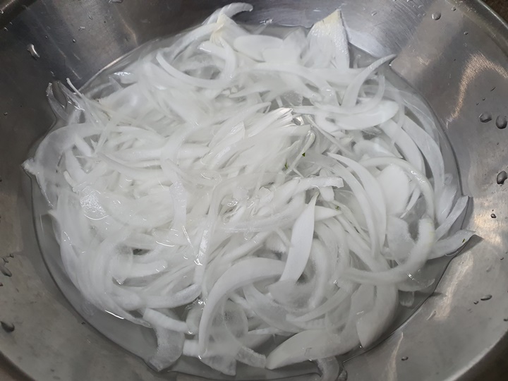 4. 양파를 최대한 얇게 채 썰어 찬물 담가놓습니다. 그리고 10분 뒤 물을 갈아주면서 2번 더 담가놓습니다. 왜냐하면 양파의 매운맛을 없애도록 하기 위함입니다.