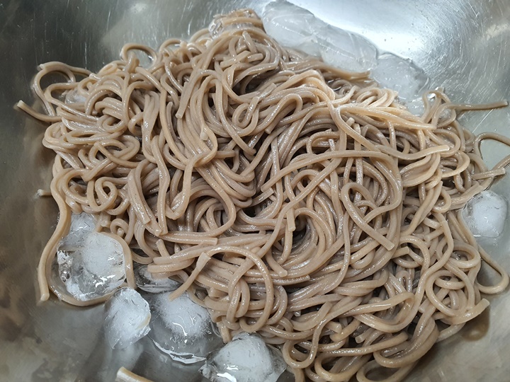 11. 냉동실 얼음을 꺼내어 그릇에 담고 그 위에 물기를 제거한 메밀면을 올려줍니다.