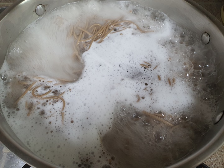 그리고 다시 끓어오르면 또 찬물을 부어줍니다. 왜냐하면 면이 퍼지지 않고 쫄깃해지기 때문입니다.