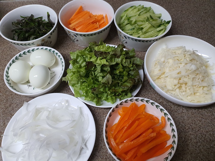 재료 : 메밀국수 1인분, 얼음, 오이, 당근, 양배추, 양파, 깻잎, 상추, 무쌈, 파프리카, 소금 1t