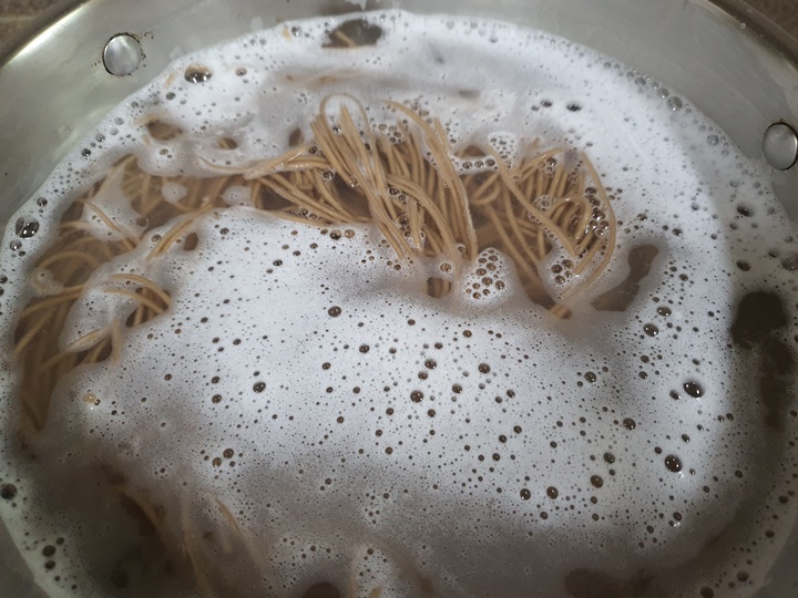 9. 메밀면이 일반 국수면보다 굵기 때문에 6분 정도 끓여줘야 합니다.