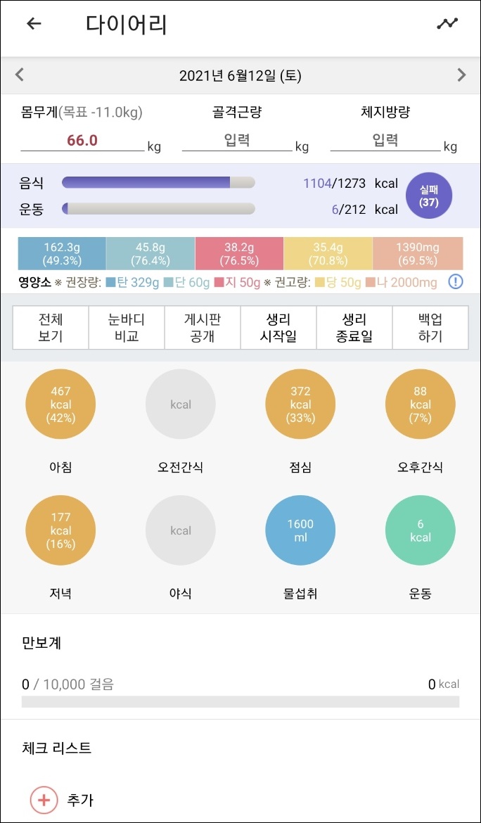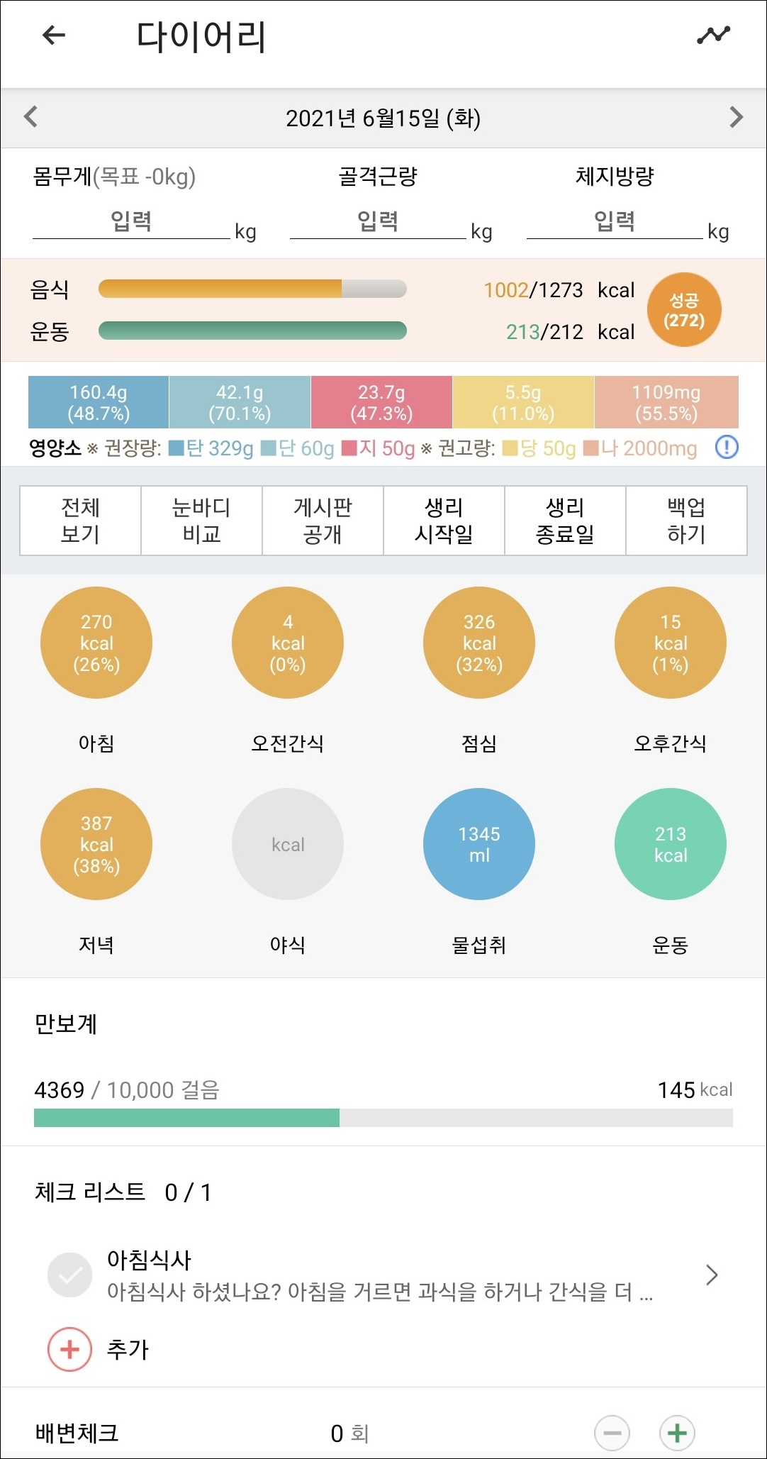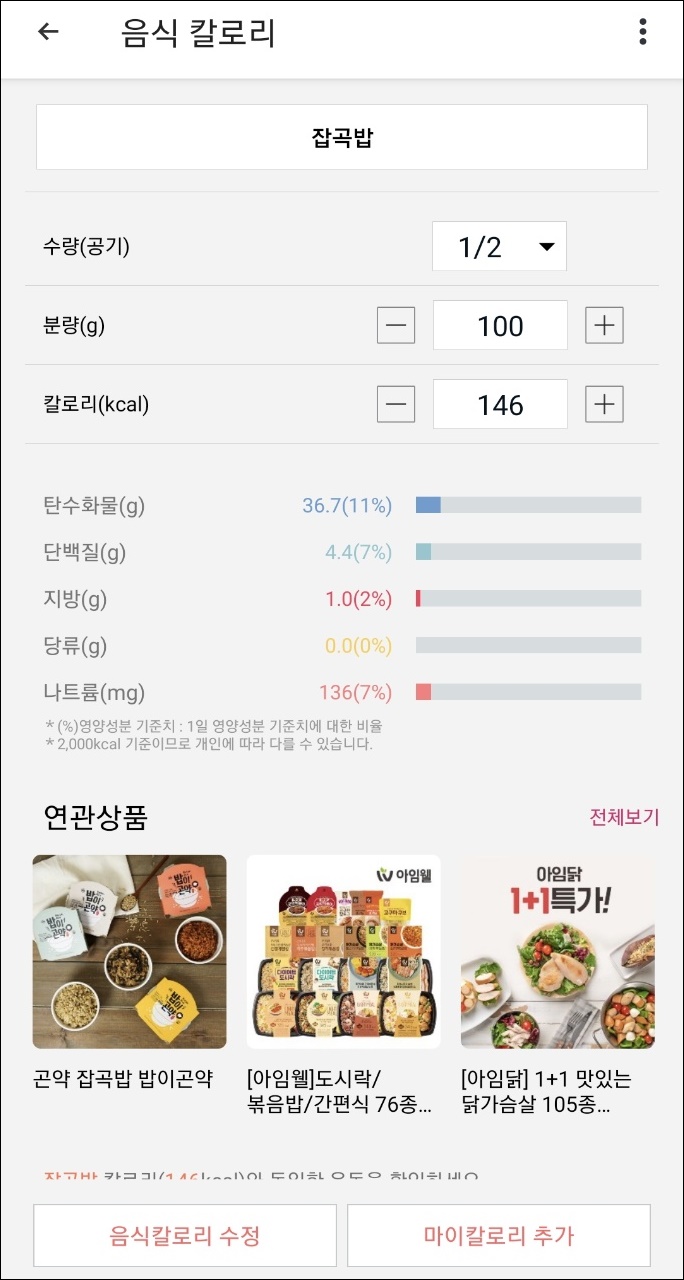 최근엔 치킨 신메뉴가 너무 먹고 싶어서 먹은 후 기록하려고 했더니 조회가 되지 않아서 제가 직접 인터넷 검색한 후 신메뉴를 입력한 후 저장하였습니다. 예를 들면, 아침 식사를 잡곡밥과 계란 프라이를 먹었다면 잡곡밥은 한 공기 중 1/4, 1/2, 4/3, 1, 1.5... 등으로 먹는 양을 조절해서 선택할 수 있습니다.