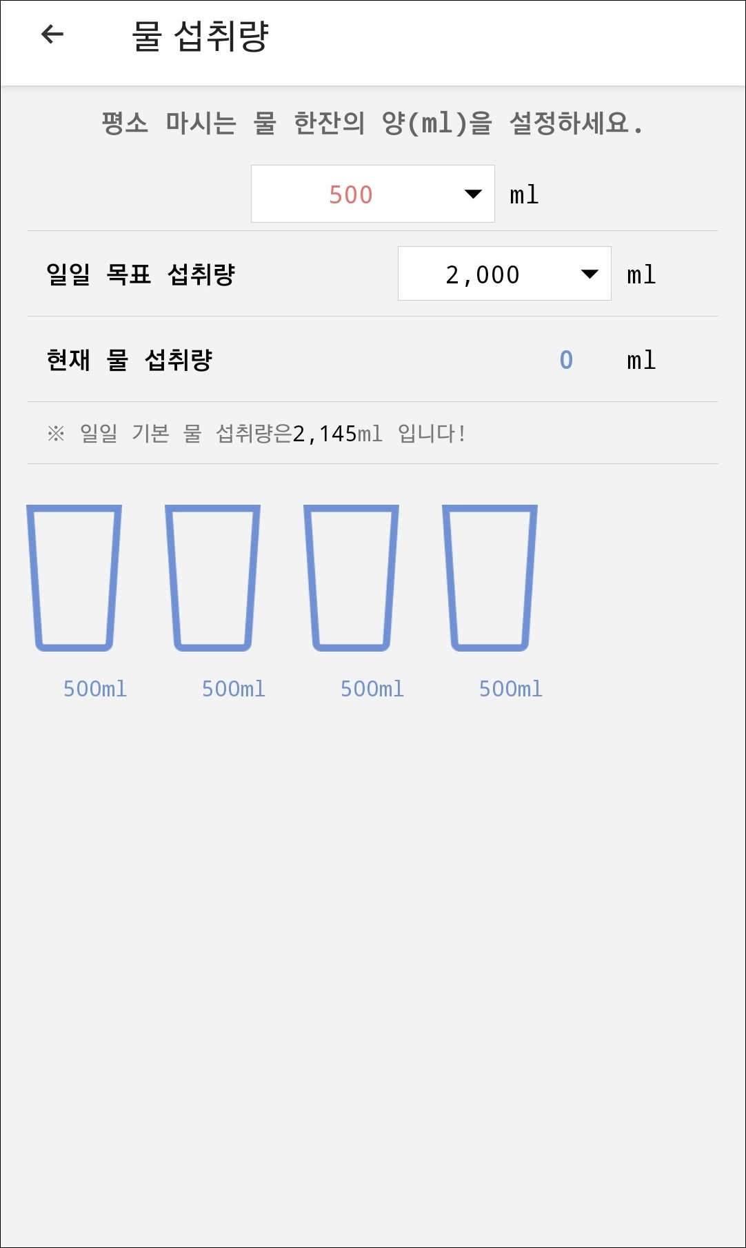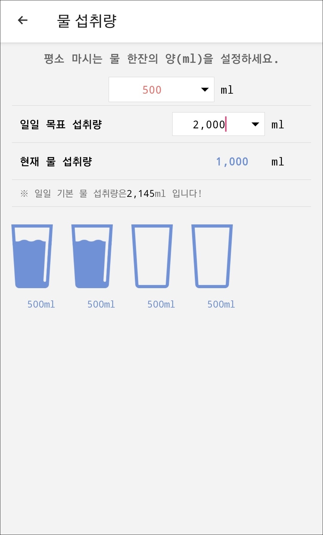 하루에 섭취해야 할 물의 양도 설정할 수 있습니다. 평소 마시는 물 한잔의 양(ml)을 설정하고 일일 목표 섭취량을 입력해주면 아래 컵의 개수가 설정에 따라 달리 표시가 됩니다. 저는 하루에 보통 500ml씩 마시기 때문에 물 한잔의 양을 500ml로 설정하고 일일 목표 섭취량을 2,000ml로 설정하였습니다.