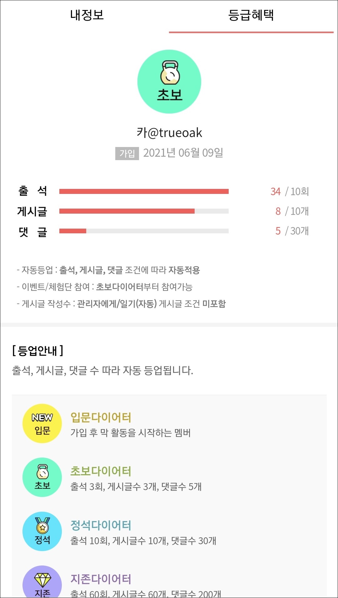 다이어트 한달 후 다이어리 음식 칼로리와 운동 칼로리, 체중변화 등을 그래프로 확인할 수 있는데 초보 등급 이상이 되어야 합니다. 처음 가입하면 입문 다이어리부터 시작하고 커뮤니티 활동에 따라 초보에서 정석, 그리고 지존 다이어터로 등업 할 수 있습니다.