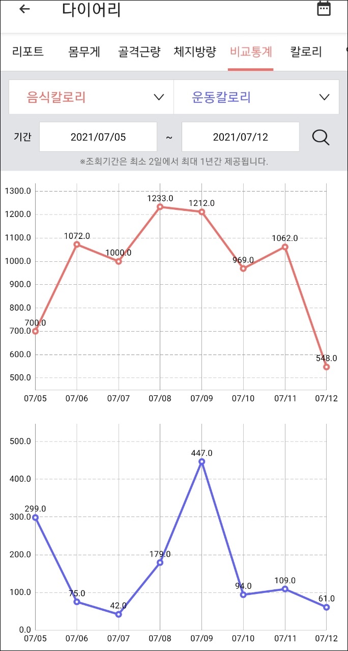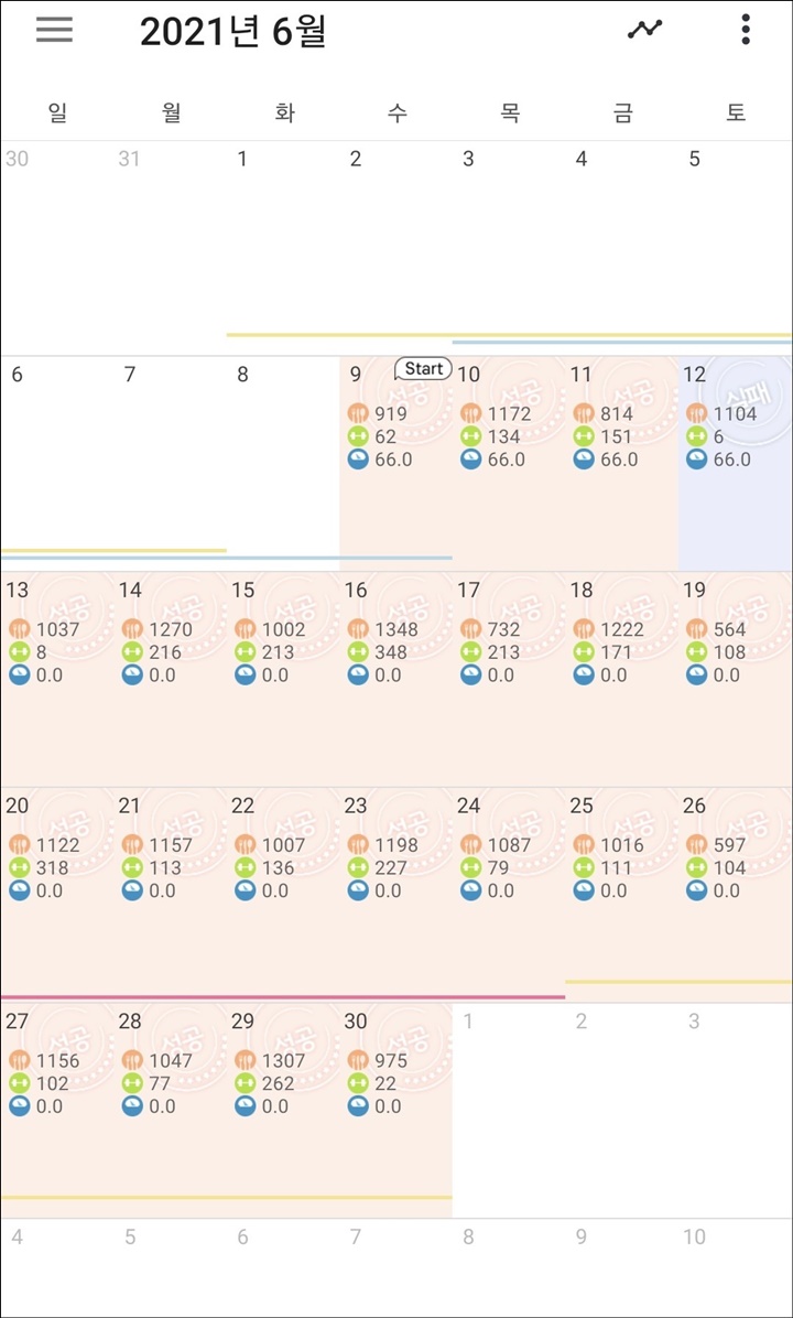 처방받은 음식 칼로리와 운동 칼로리를 잘 지켜주면 붉은색으로 표기가 되고 실패했을 경우엔 보라색으로 표기가 됩니다. 다이어리에 보라색으로 표기되는 것이 싫어서 먹은 음식만큼 운동을 더 하려고 노력하였습니다. 그랬더니 보라색이 하루밖에 없네요.