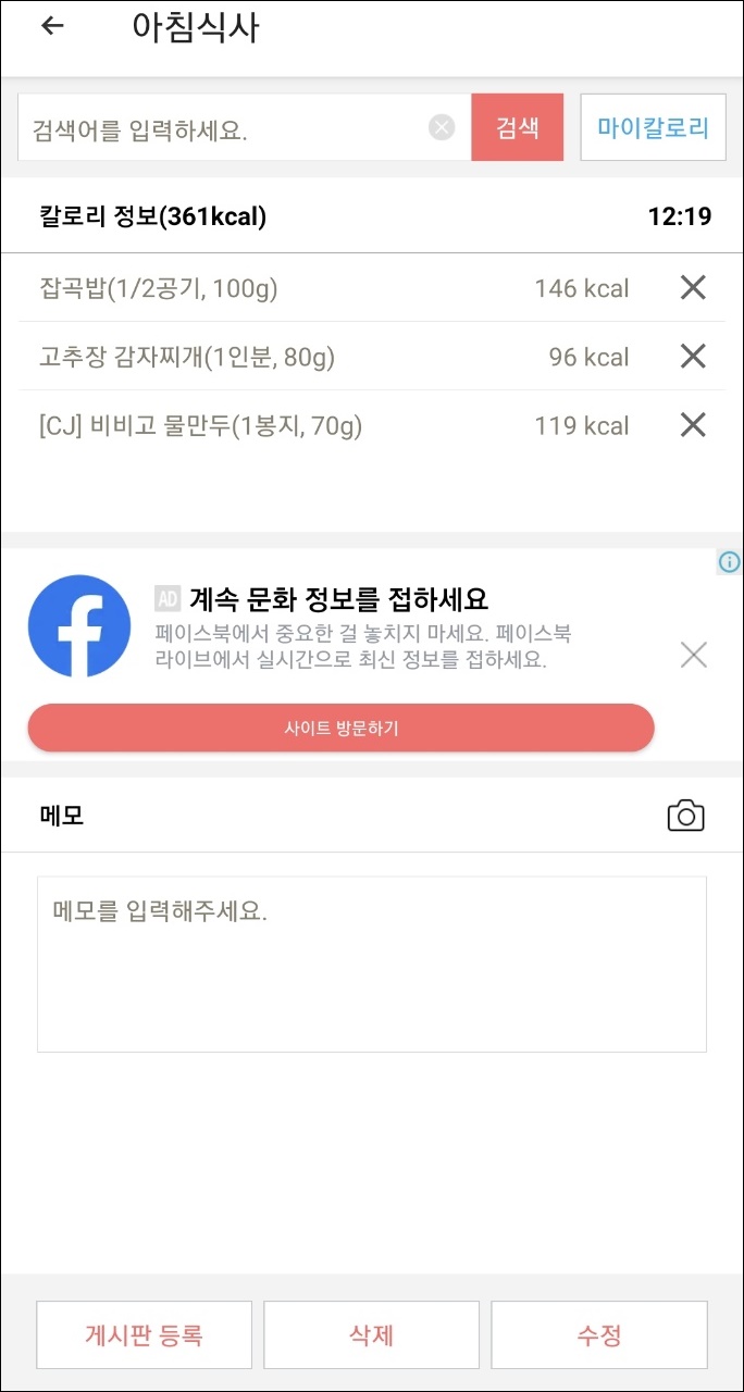 메뉴 중 다이어리에 가시면 하루하루 먹는 음식명과 음식량을 입력해주면 자동으로 칼로리가 계산이 됩니다. 음식명은 일반 식단명이나 브랜드명을 입력해주시면 검색이 되고 선택할 수 있는데 가끔 등록되어 있지 않은 음식은 수동으로 '음식 칼로리 직접 입력+' 메뉴를 통해 입력할 수 있습니다.