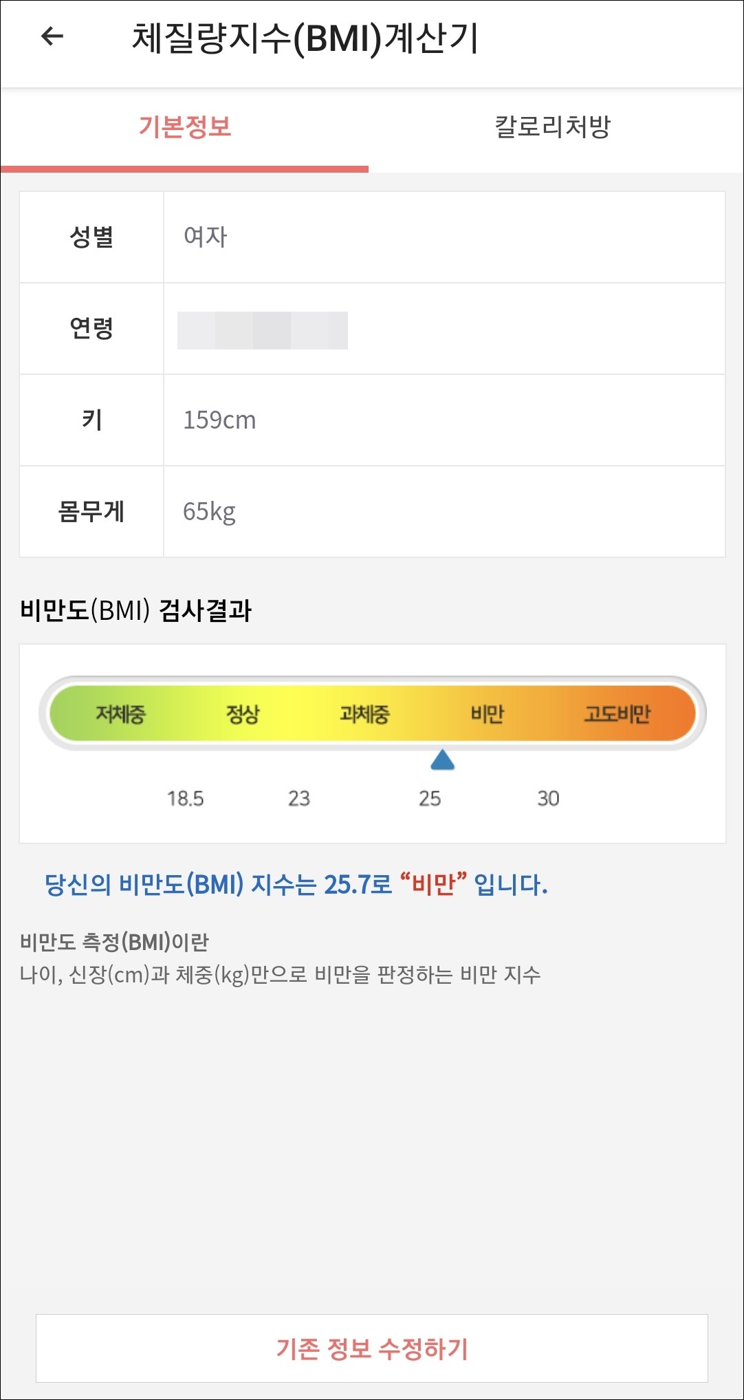 홈 화면에서 먼저 전체메뉴로 가면 '비만도 계산기, 칼로리 처방'이라는 메뉴가 있습니다. 여기에서 키, 현재 몸무게, 목표 체중, 다이어트 시작일, 체중 감량 기간 등을 설정해주시면 하루에 먹어야 할 음식 칼로리와 운동 칼로리 처방을 받을 수 있습니다.