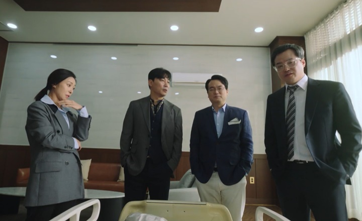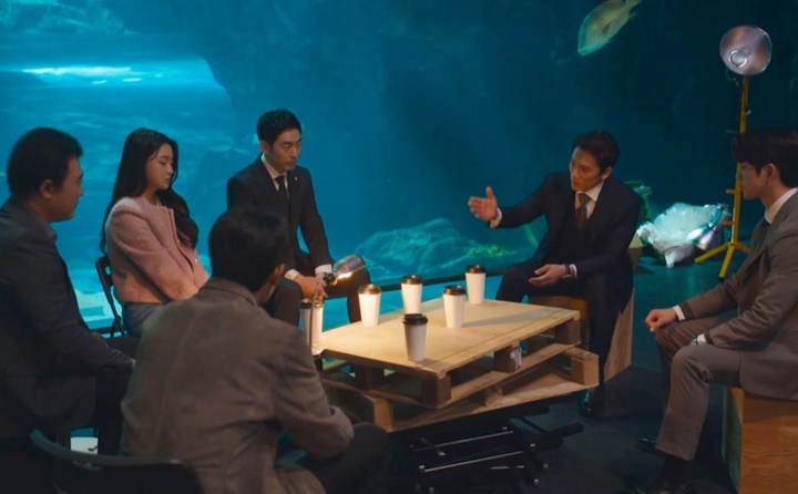 강요한은 김가온에게 보여줄 게 있다며 공사가 진행 중인 아쿠아리움 수족관으로 그를 데리고 갔습니다. 그곳엔 한 남자가 서 있었고 잠시 후 여러 사람들이 들어왔는데요. 그중엔 1차 시범재판에서 JU케미컬 주일도 회장을 변호한 변호사도 있었습니다.