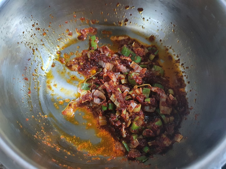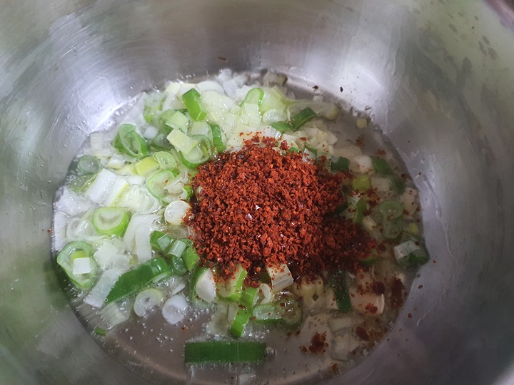 2. 약불에 서서히 파기름을 내는데 매운향이 없어지고 고소한 향이 나면 고춧가루를 넣어 약불에 볶아줍니다. 그러면 파향이 가득한 고추향이 만들어집니다.
