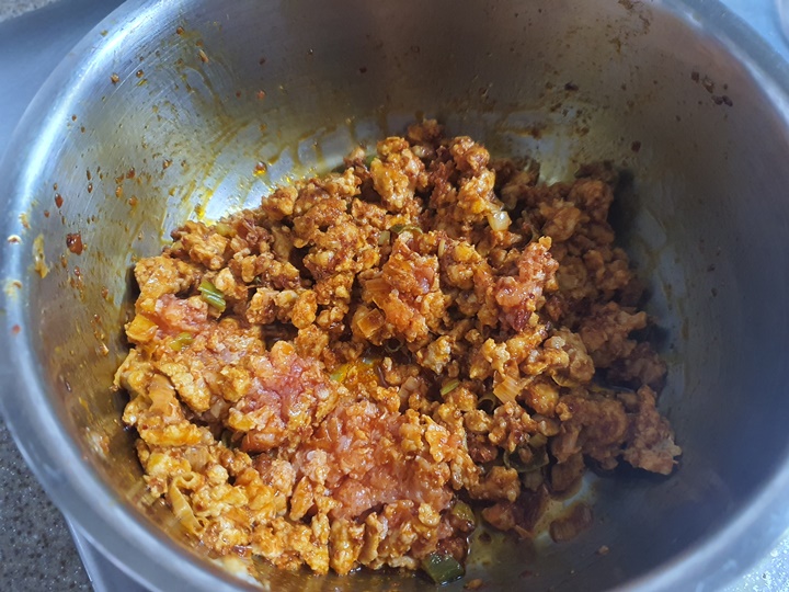 3. 고추기름에 다진 돼지고기를 넣어 익을 때까지 볶아줍니다. 다진 돼지고기가 많아보여도 넉넉해야 맛이 있더라구요.