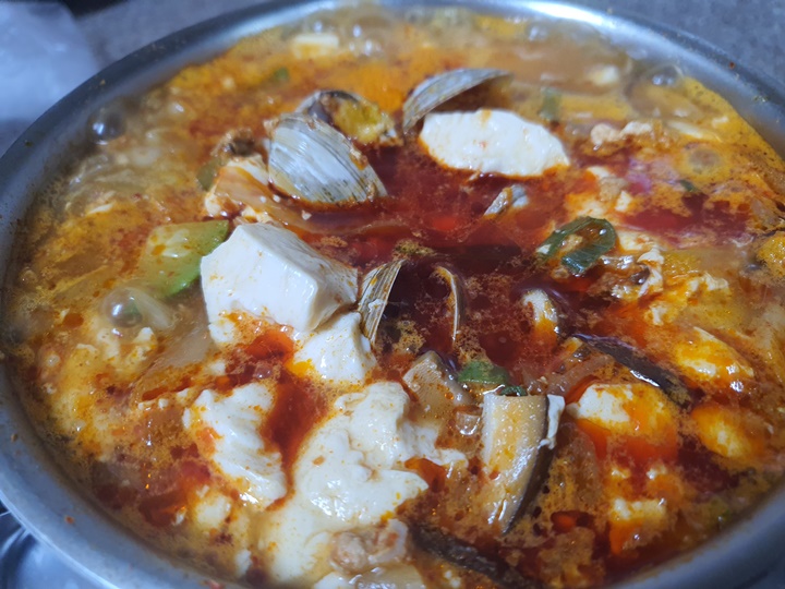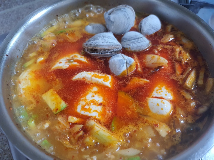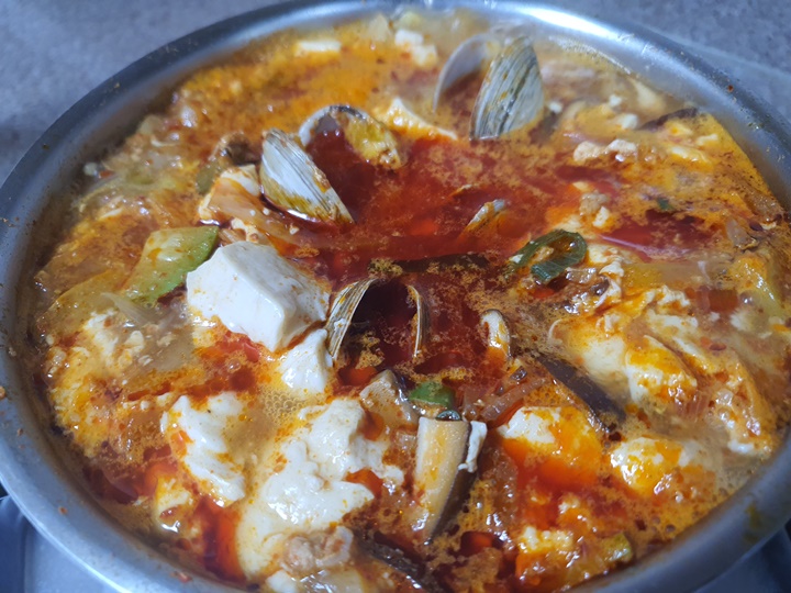 아래 순두부찌개 만드는 방법대로 하면 맛있게 순두부찌개를 만들 수 있습니다. 순두부찌개 양념을 구매할 때 여러 개 묶음으로 사서 주 1회는 해 먹는 것 같습니다. 그리고 바지락은 가격이 저렴할 때 사서 해감시키고 냉동시켜서 먹습니다.