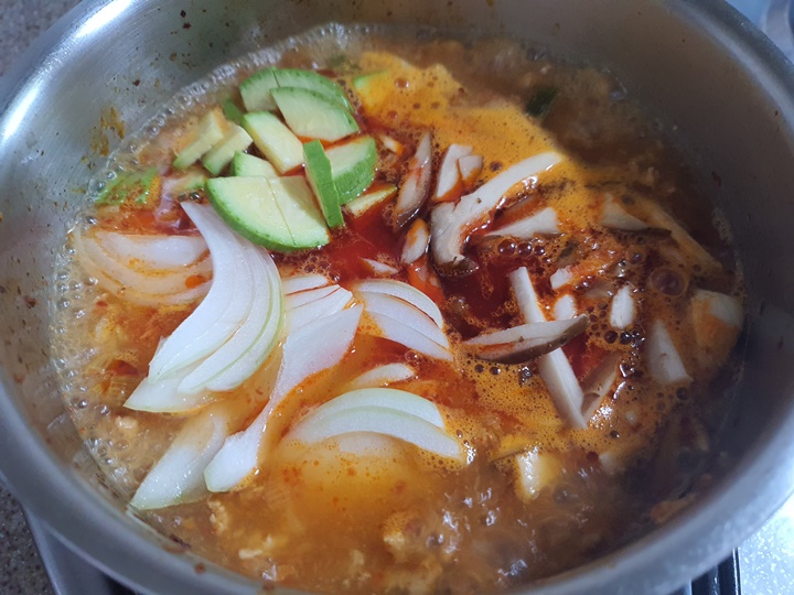 5. 애호박, 양파, 표고버섯을 넣고 보글보글 끓으면 바지락을 넣어줍니다.