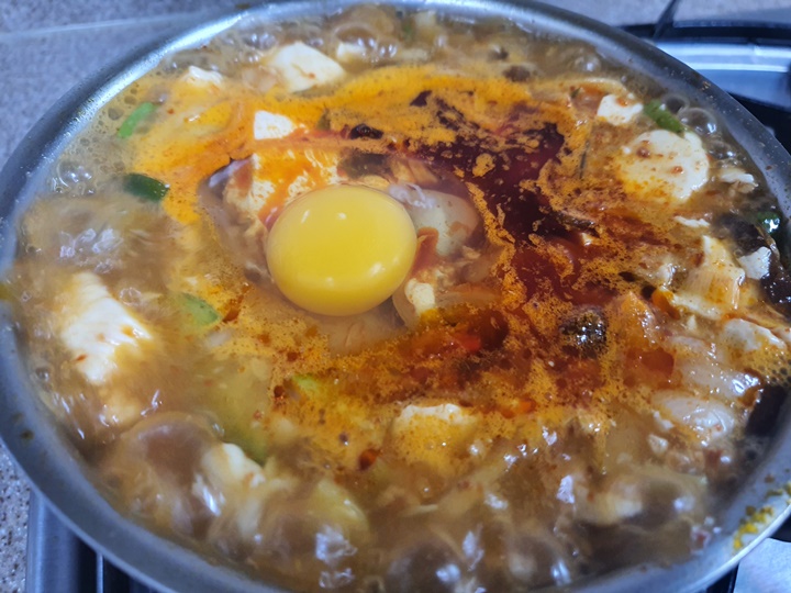 6. 그리고 순두부를 썰어 넣어주고 마지막으로 달걀 하나를 깨어 넣어줍니다.
