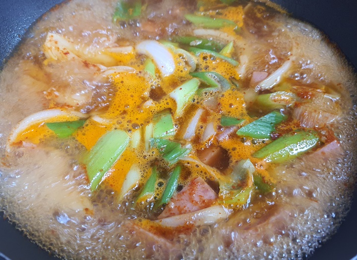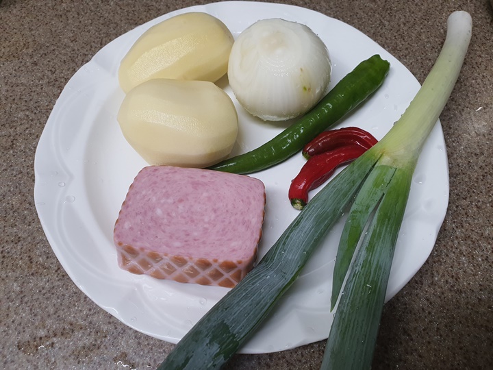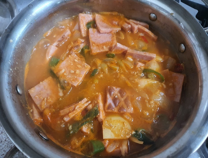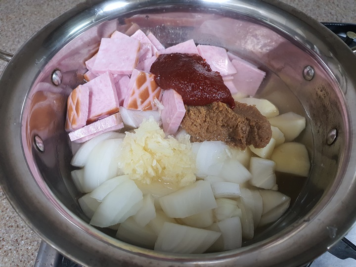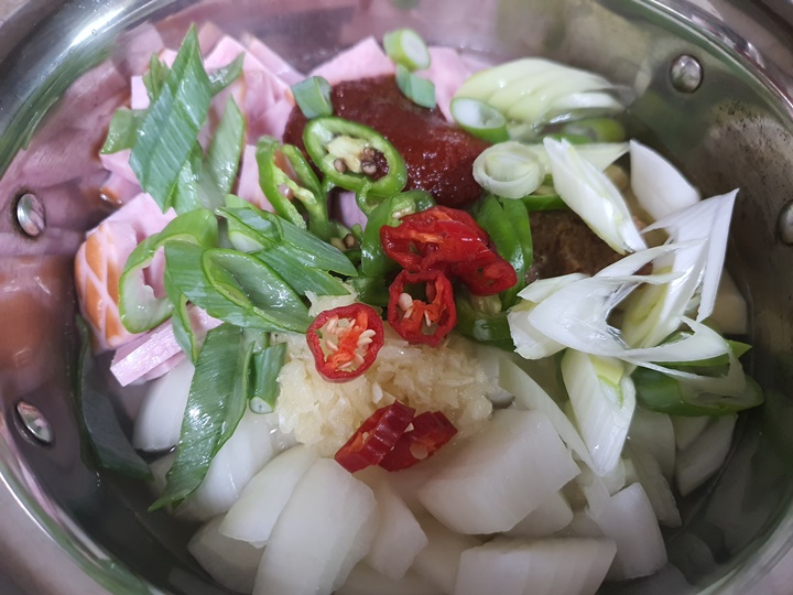 재료 : 햄(스팸), 감자 2개, 양파 소, 대파, 애호박, 홍고추, 청고추, 고추장 1T, 된장 1/2T, 다진 마늘 1T
