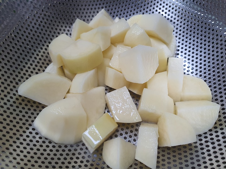 4. 감자는 깍둑썰기를 하고 애호박, 양파도 듬성듬성 썰어줍니다.