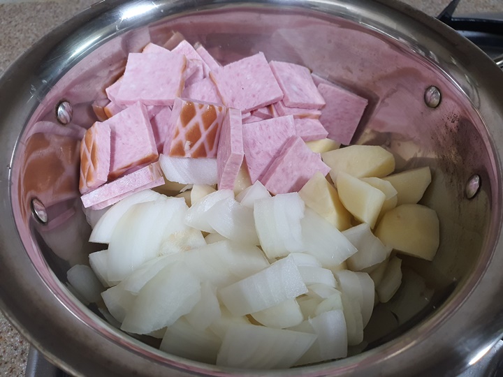 8. 냄비에 감자, 햄, 양파, 애호박 순으로 넣어준 후 물은 200ml 정도 부어줍니다.