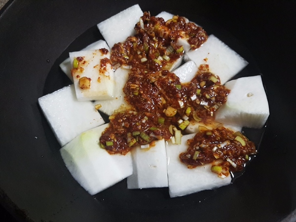 9. 가자미가 익더라도 무가 완전히 익어 부드러워질 때까지 양념을 끼얹으면서 졸여줍니다.