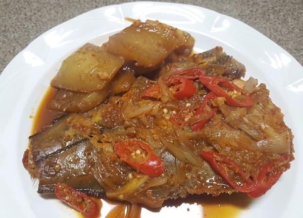 재료 : 반건조 가자미 2마리, 무, 양파, 대파, 홍고추